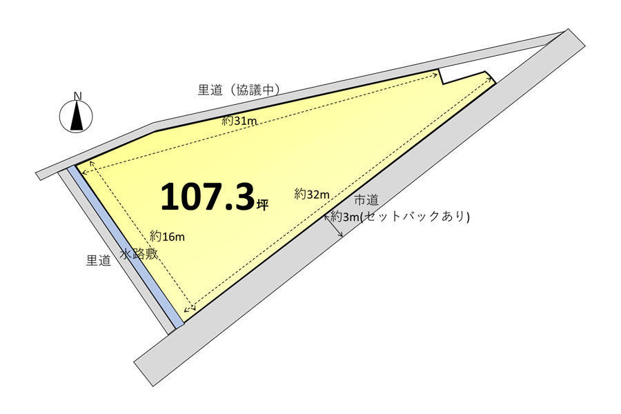 | 備考 | ■市水道引込可(工事費自己負担) ■合併浄化槽工事自己負担 ■排水路工事必要 ■南東道路セットバックあり |