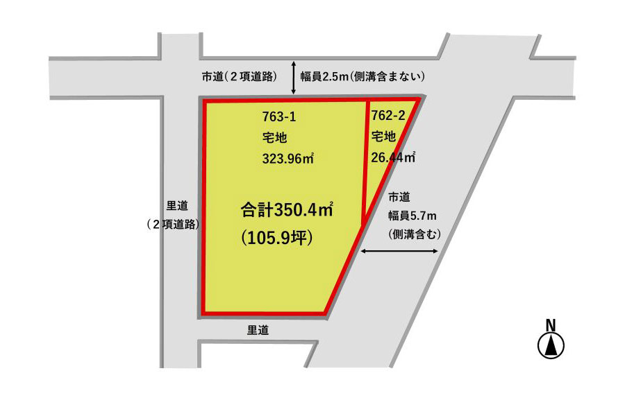 | 接道状況 | 南東側幅員5.7mの公道、北側幅員2.5m(2項道路)、西側(2項道路)に接道 | ||