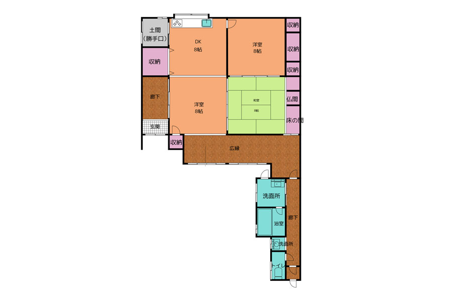 ガス給湯、IHクッキングヒーター、グリル付、バス・トイレ別、温水洗浄便座、トイレに窓、シャワー、浴室に窓、脱衣所、洗面脱衣所、洗面所独立、洗面台、シャワー付き洗面化粧台、洗面所に窓、押入れ、クローゼット、勝手口、縁側、室内洗濯機置場、