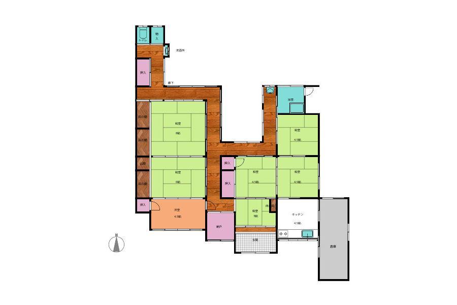 ガス給湯、灯油ボイラー、バス・トイレ別、トイレに窓、浴室に窓、洗面台、洗面所に窓、下駄箱、押入れ、納戸、勝手口、倉庫付、専用庭、